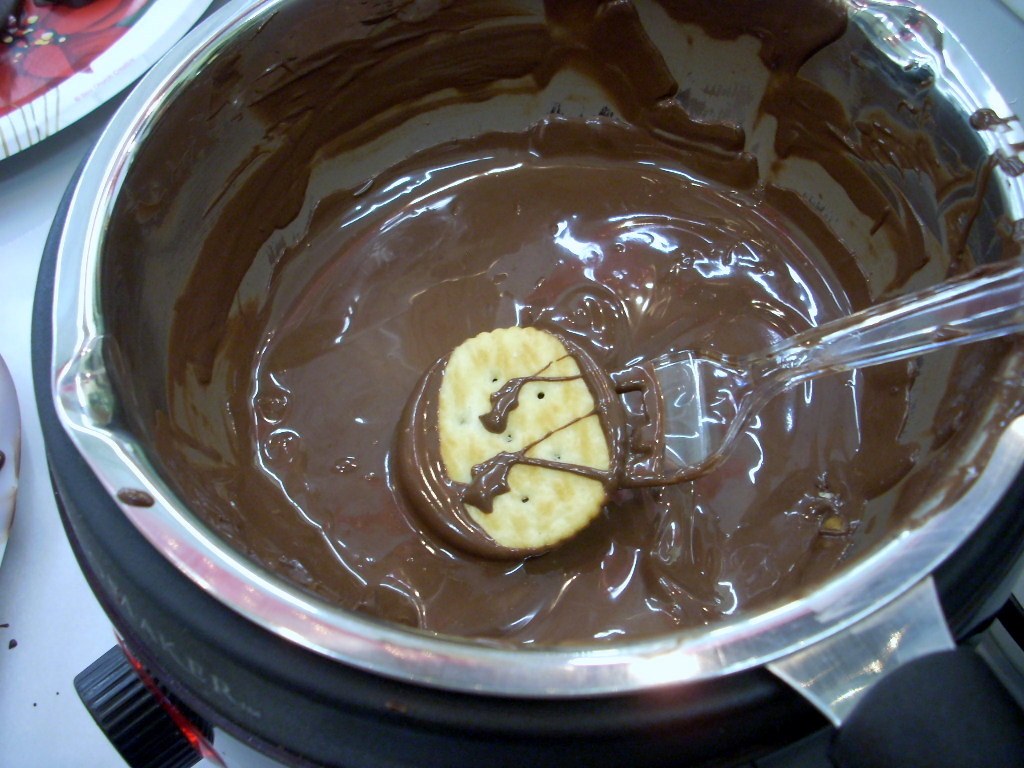 Toss a Ritz Cracker into the melted chocolate and toss to coat. Gently tap the cracker on the side of the bowl to remove some of the excess chocolate.