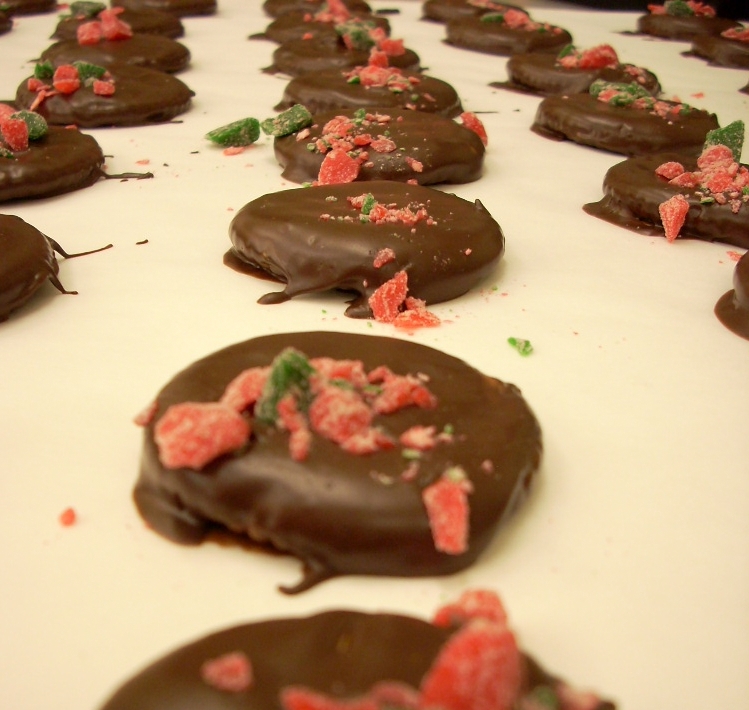 Remove from the chocolate and place on parchment paper.  Before the chocolate sets up sprinkle the tops with the crushed candy cane, or if you can find them, crushed red and green mint candies.