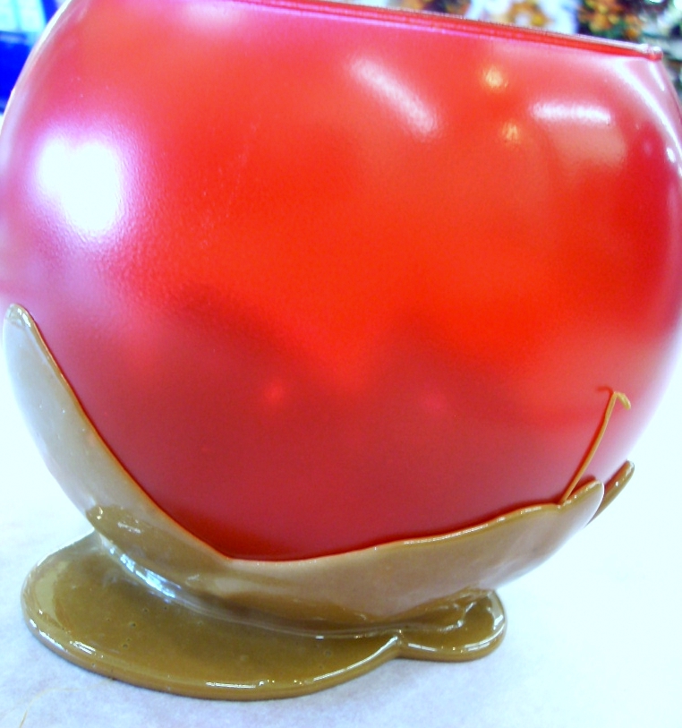 While it was drying I put some glue pellets in my hot glue skillet. (I’ll have to do a blog post about that sometime…it’s fabulous!) Lay out a sheet of parchment paper to put the bowl on. Once all the glue pellets were melted I added acrylic paint to the hot glue, turned the bowl upside down and poured the hot glue over top. BE VERY CAREFUL!! I flipped it upright again and let the glue puddle.