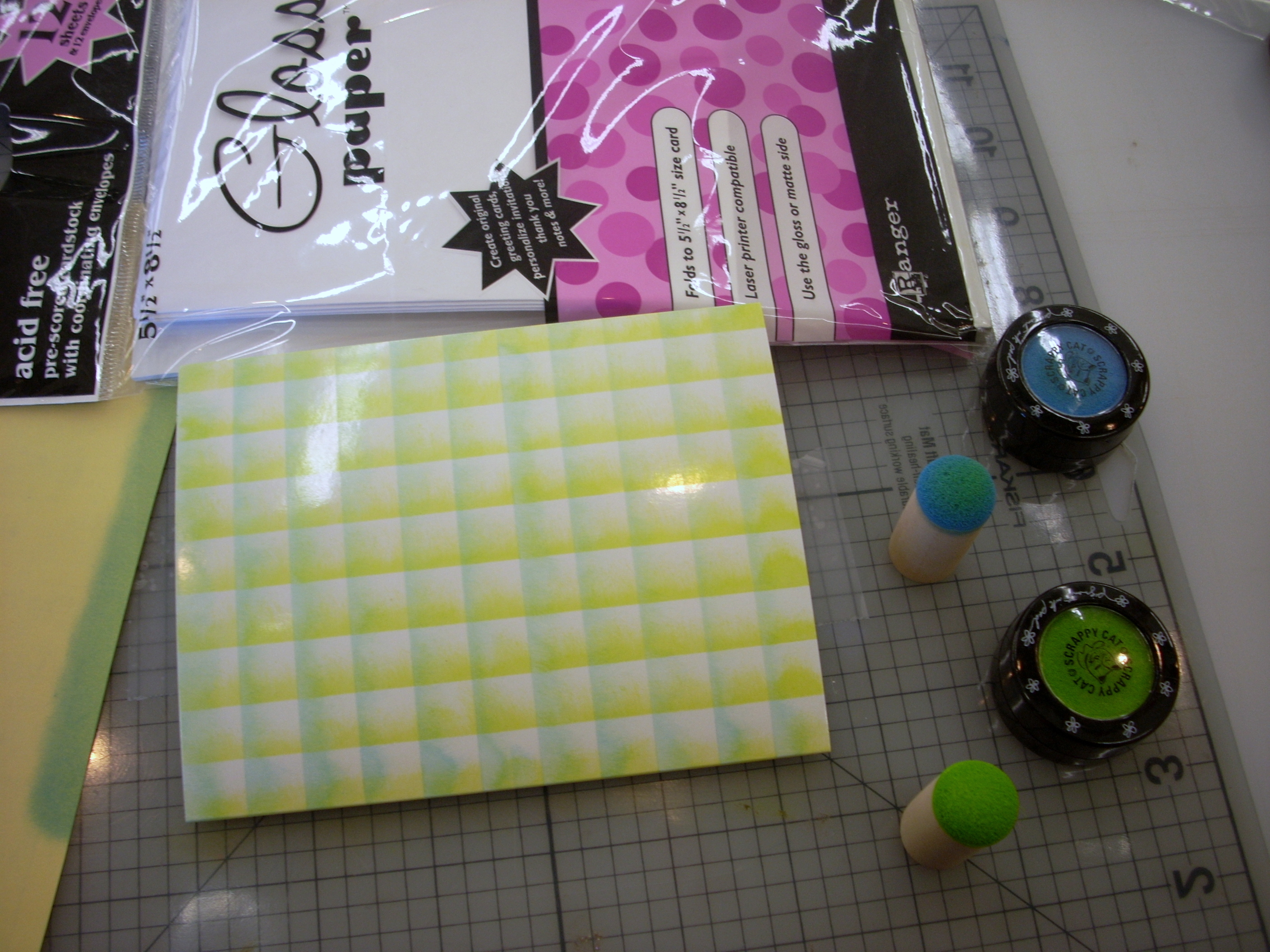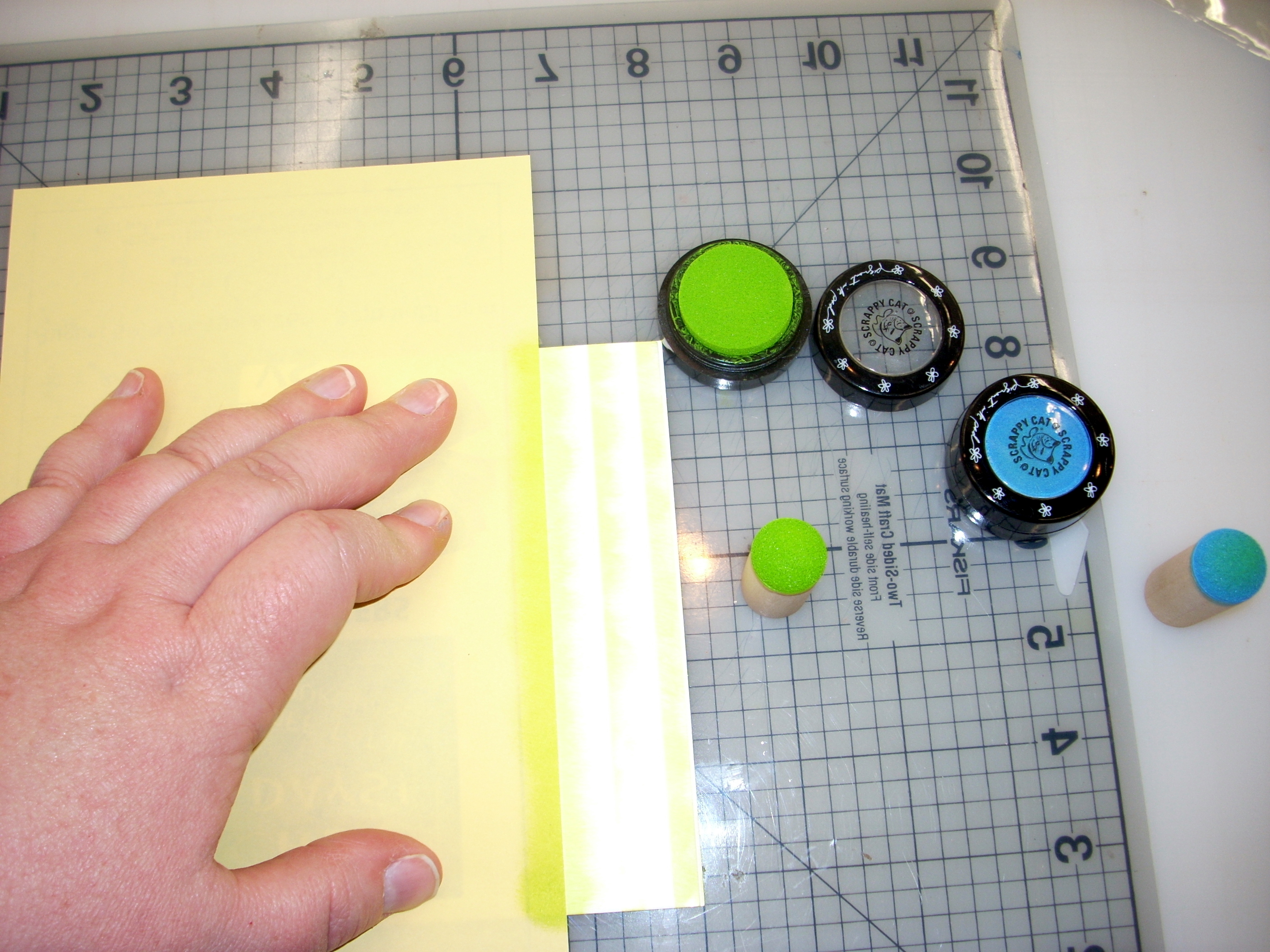 Lay the scrap cardstock straight across the glossy cardstock. Dab one color of ink (green) in lines all the way across the cardstock. To dab start by placing the ink dauber on the scrap cardstock and then lightly and quickly rub off the scrap cardstock and onto the glossy cardstock. That way there is a more concentrated amount/color of ink near the scrap card stock that slow fades into the white glossy cardstock.