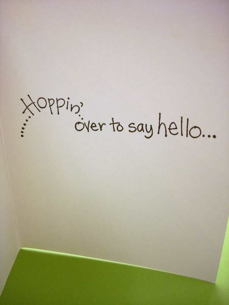 Cut a piece of green cardstock to 3 3/4 inches by 3 3/4 inches. Stamp the frog onto a piece of white card stock that is 2 1/2 inchs by 2 1/2 inches and use the green ink dauber to color just the edge of the white cardstock. Adhere the two layers together and then put them on the card.