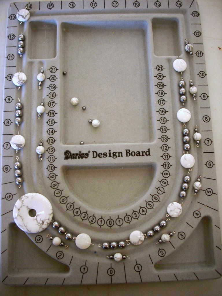 Oooh… I love this necklace, Vicki! The howlite and grey pearls together look so chic–and I think that you have convinced me to give one of those planning boards a try. I usually start in the middle and then find myself spending too much time trying to match up the sides, add length, etc.