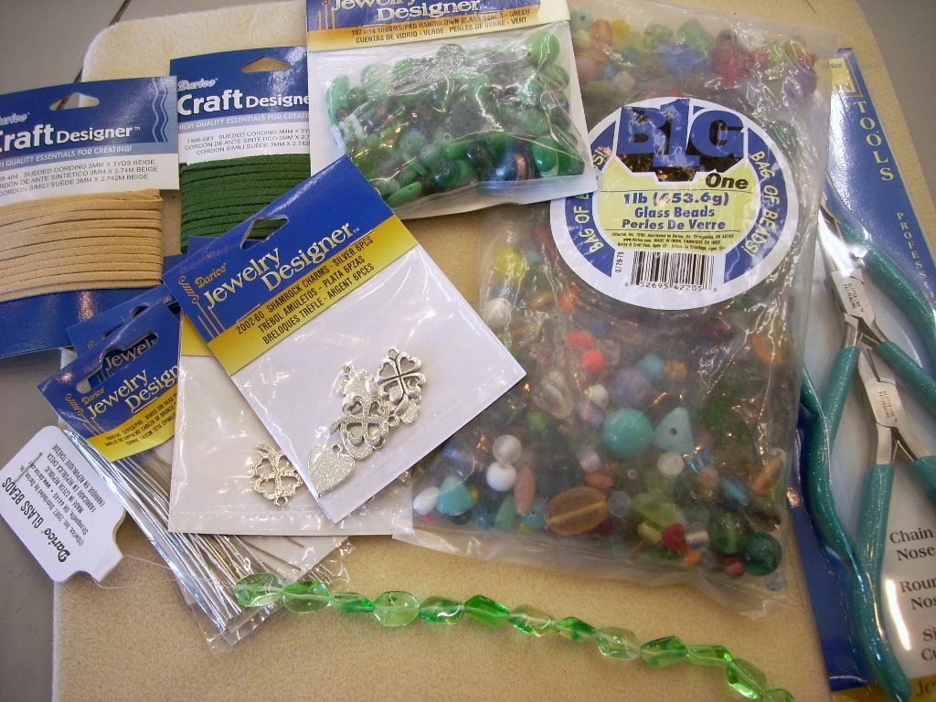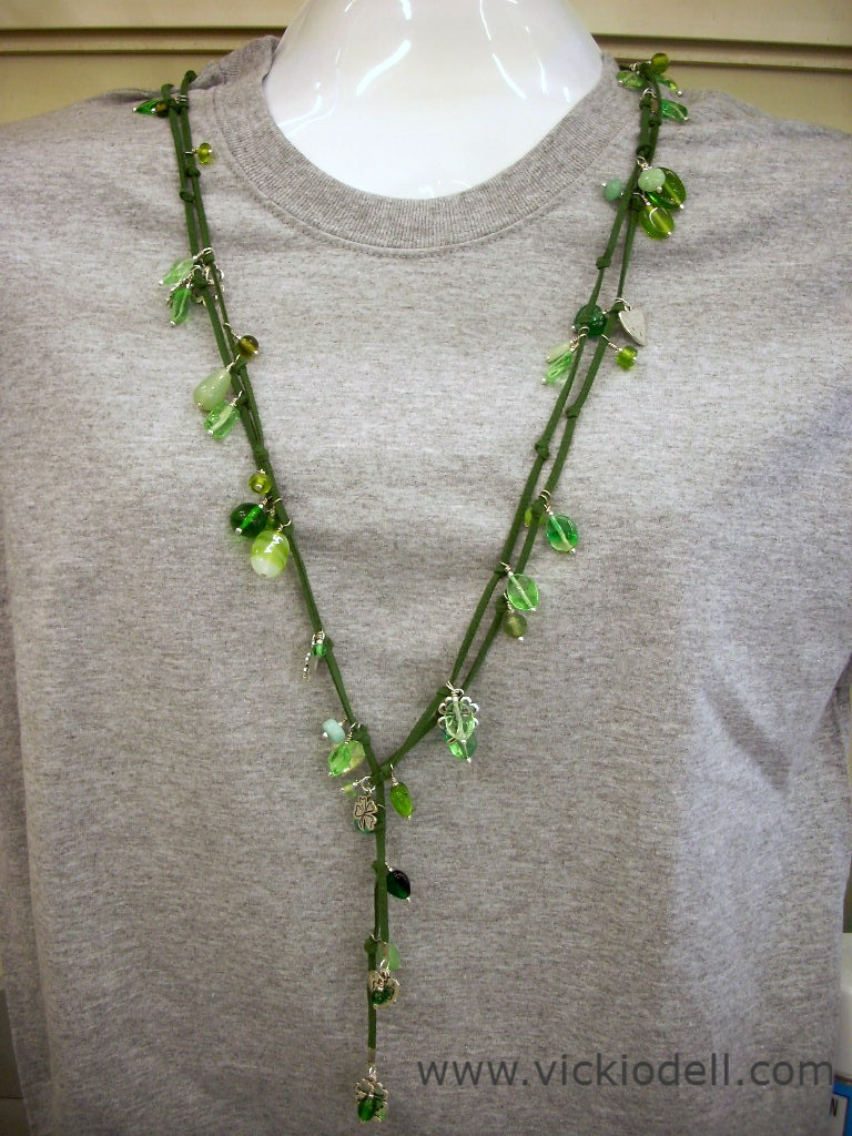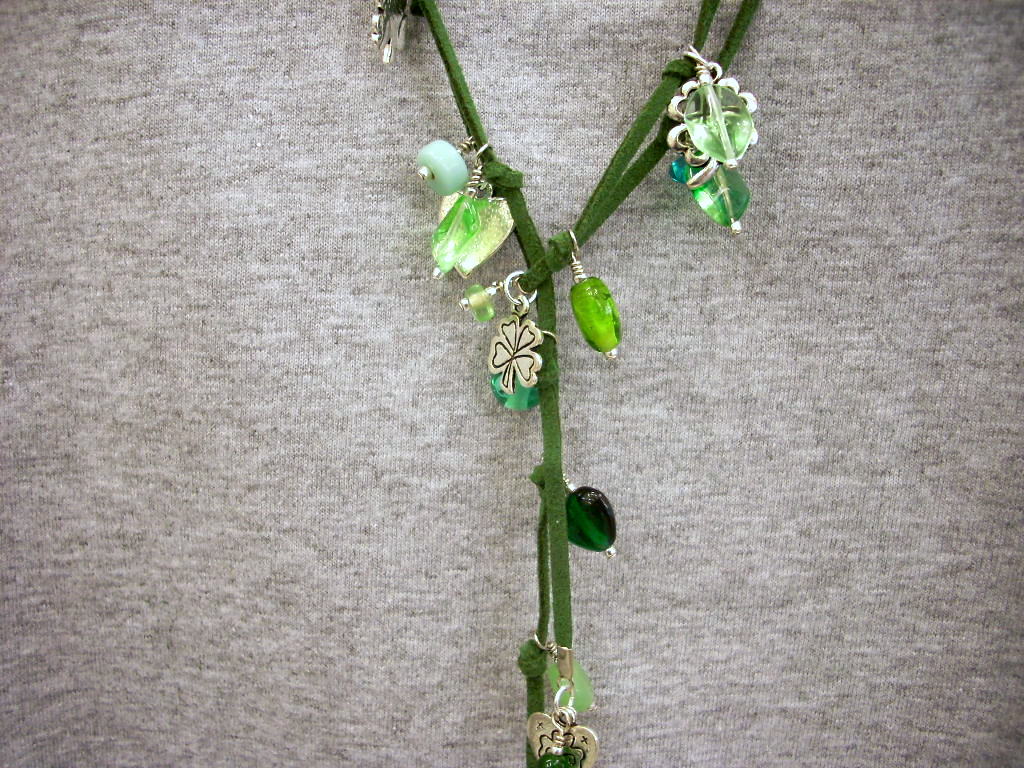 While I’m not a big fan of St Patrick’s Day, I am a big fan of the color green and lariat necklaces. I like them because they are versatile and can be worn in many configurations, they have no clasp (so I don’t have to reach behind my head and try to fasten something I can’t see) and they can be super simple to make but still have a lot of impact. Just like this Lucky Lariat.