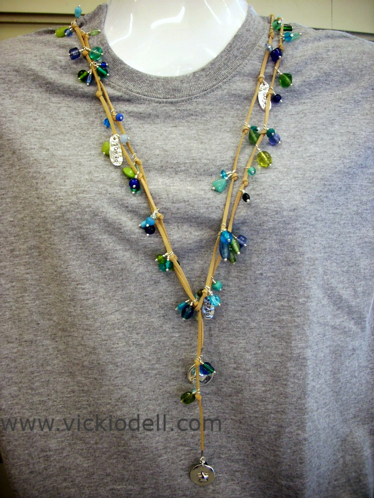 Oh, and by the way, there are so many beads in the bag of glass beads that you can easily make a second lariat with a package of tan sueded cord and a few more charms.