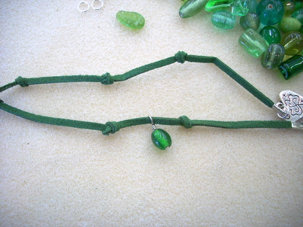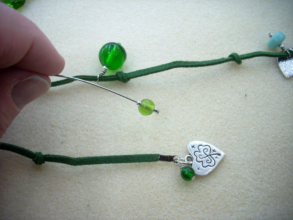 Put a seed bead, bead and then seed bead on a head pin. Make a simple loop, slide the loop over the sueded cord and wrap the wire around.