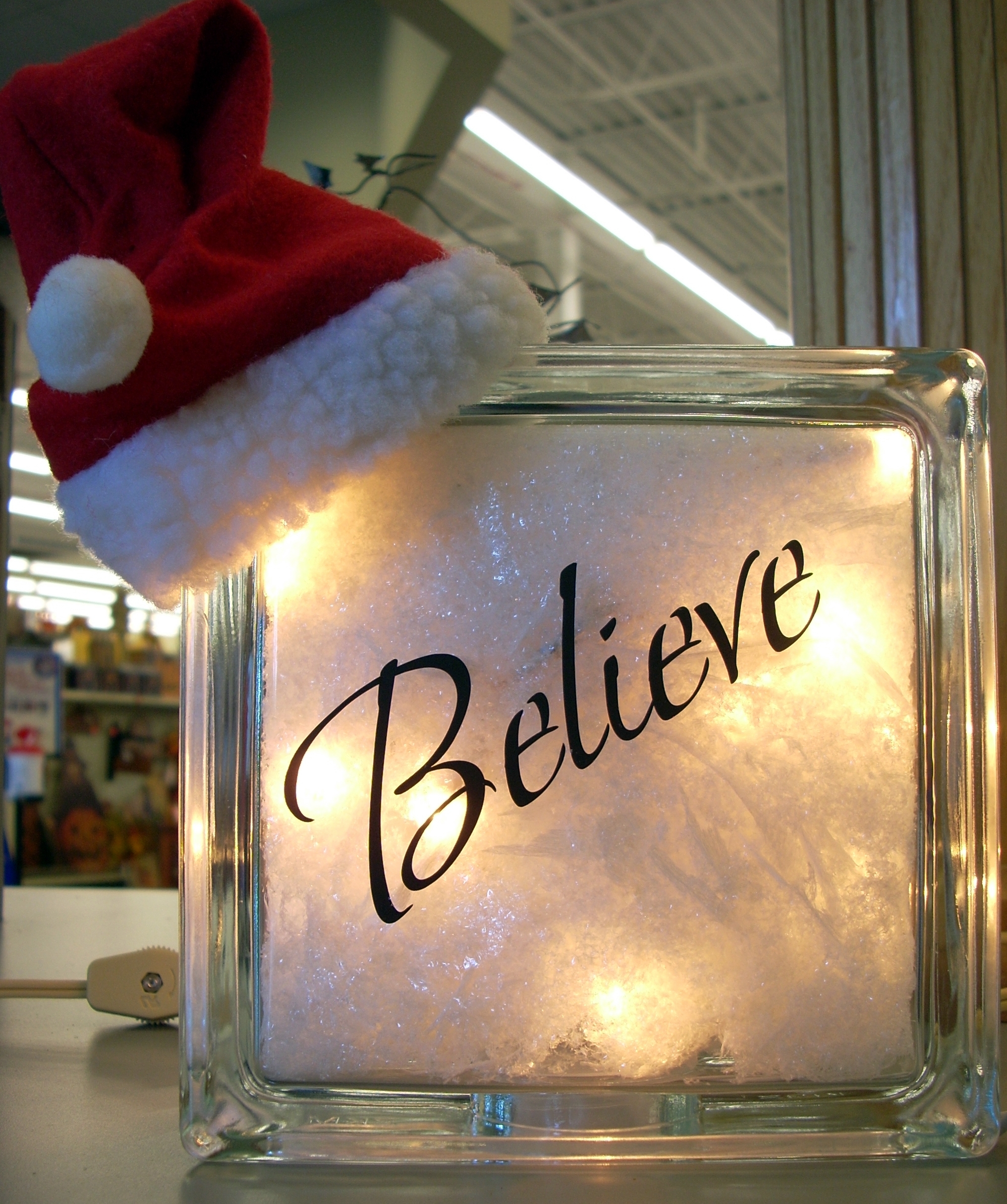 “Believe” has a small string of tiny lights and shredded styrofoam inside with a small santa hat glued to the corner.
