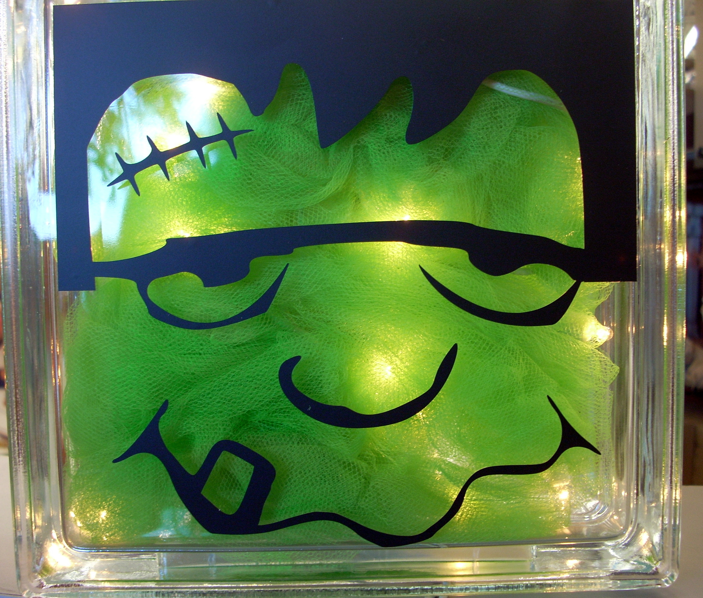 With this one I just used a strand of 25 tiny white lights with green tulle wrapped around the wire and the Frankenstein face adhered to the blok. Familiar craft…different look!