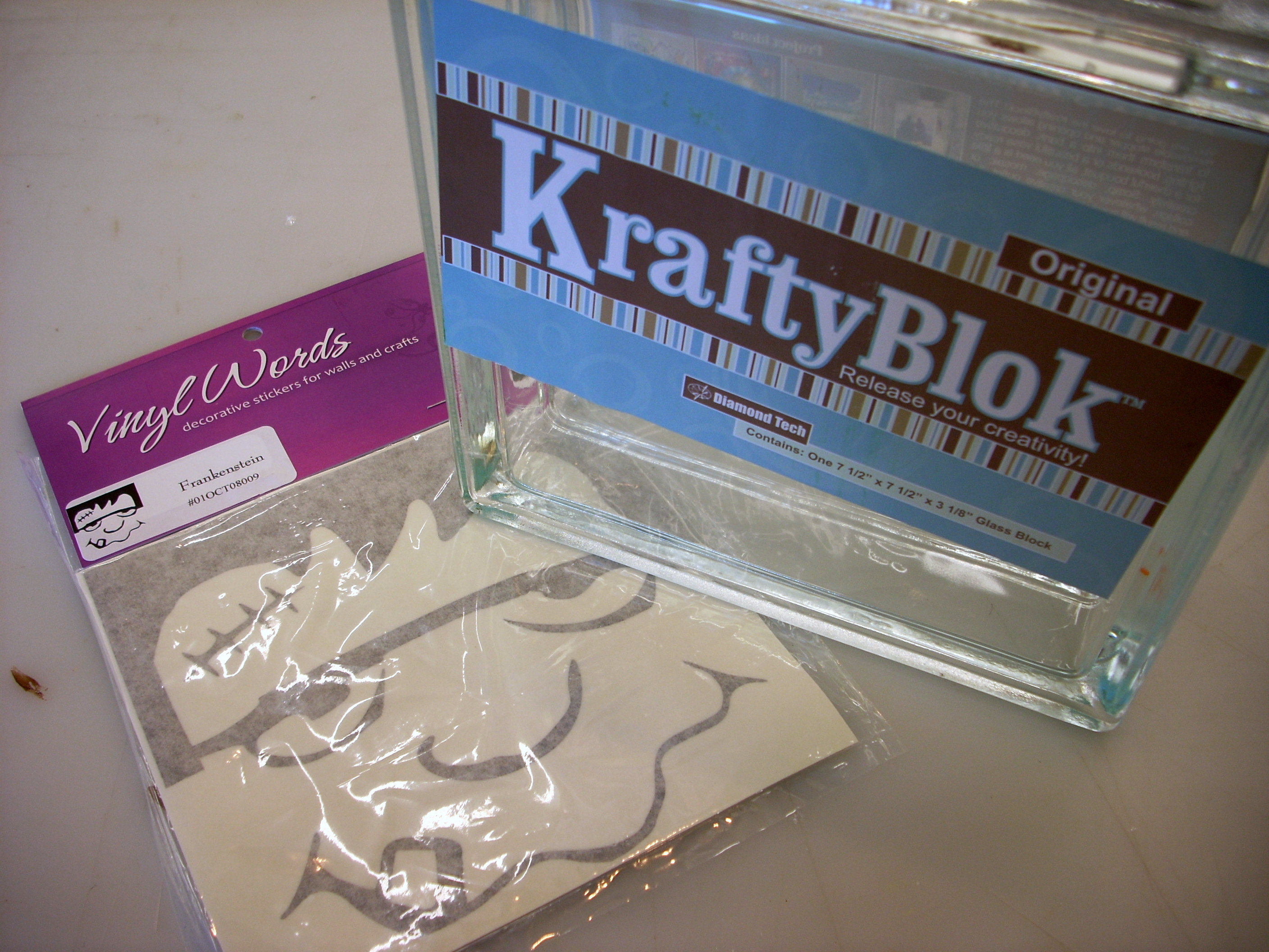 I found a new product… I wasn’t sure how I was going to feel about it at first.  To me, those glass block crafts are what I call a “granny craft” and have been “done to death” BUT Vinyl Words vinyl transfers that you can add to the face of KraftyBlok to add a little something new to them.  It’s a craft we are all familiar with but with a little different twist.