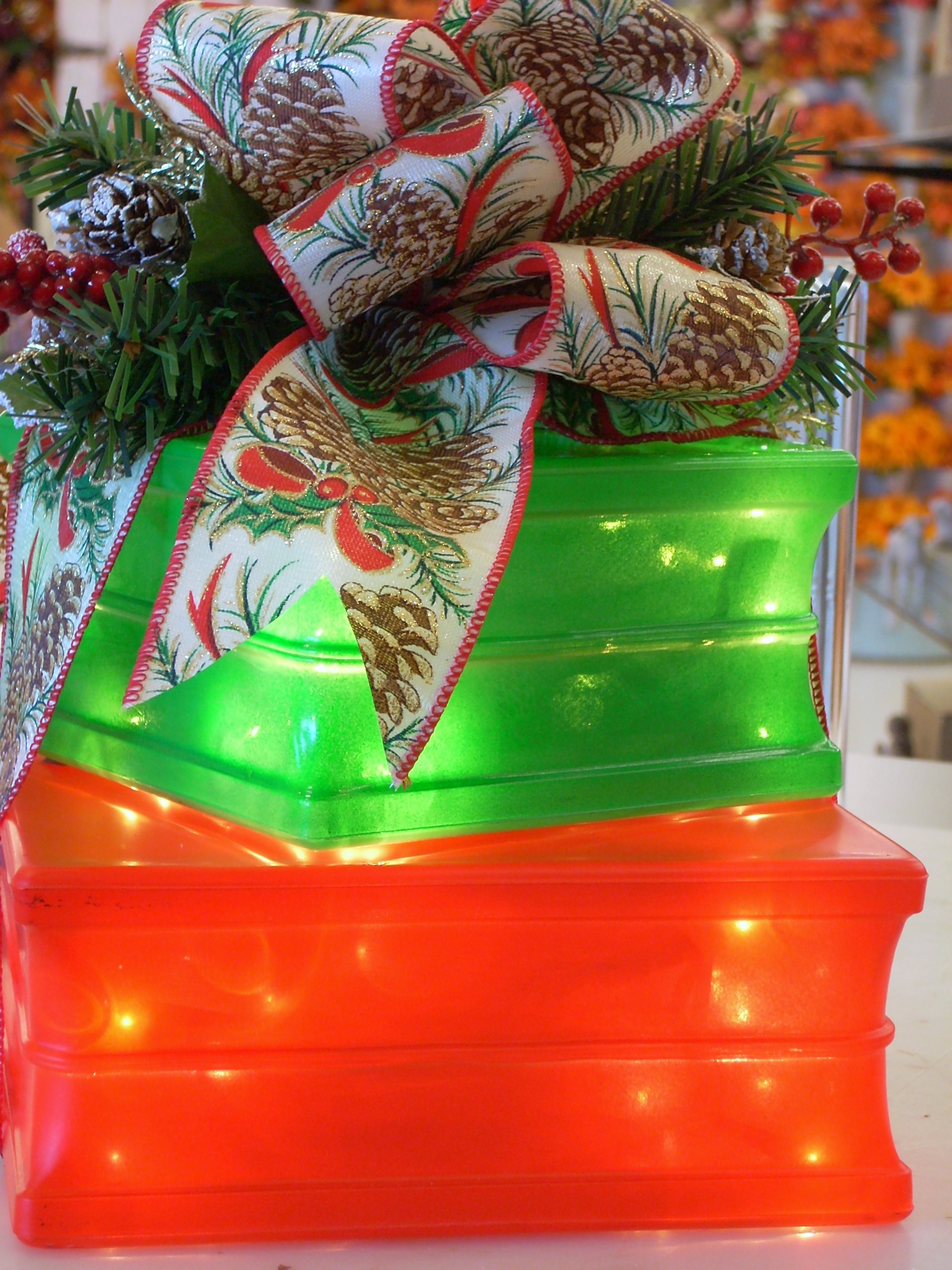 The double stack of bloks were spray painted with Design Master spray paints and allowed to dry (there is a large and small blok in the stack).  I used floral cling to attach the bloks to one another and added a bow along with two floral picks to the top. There is a strand of lights in each blok.