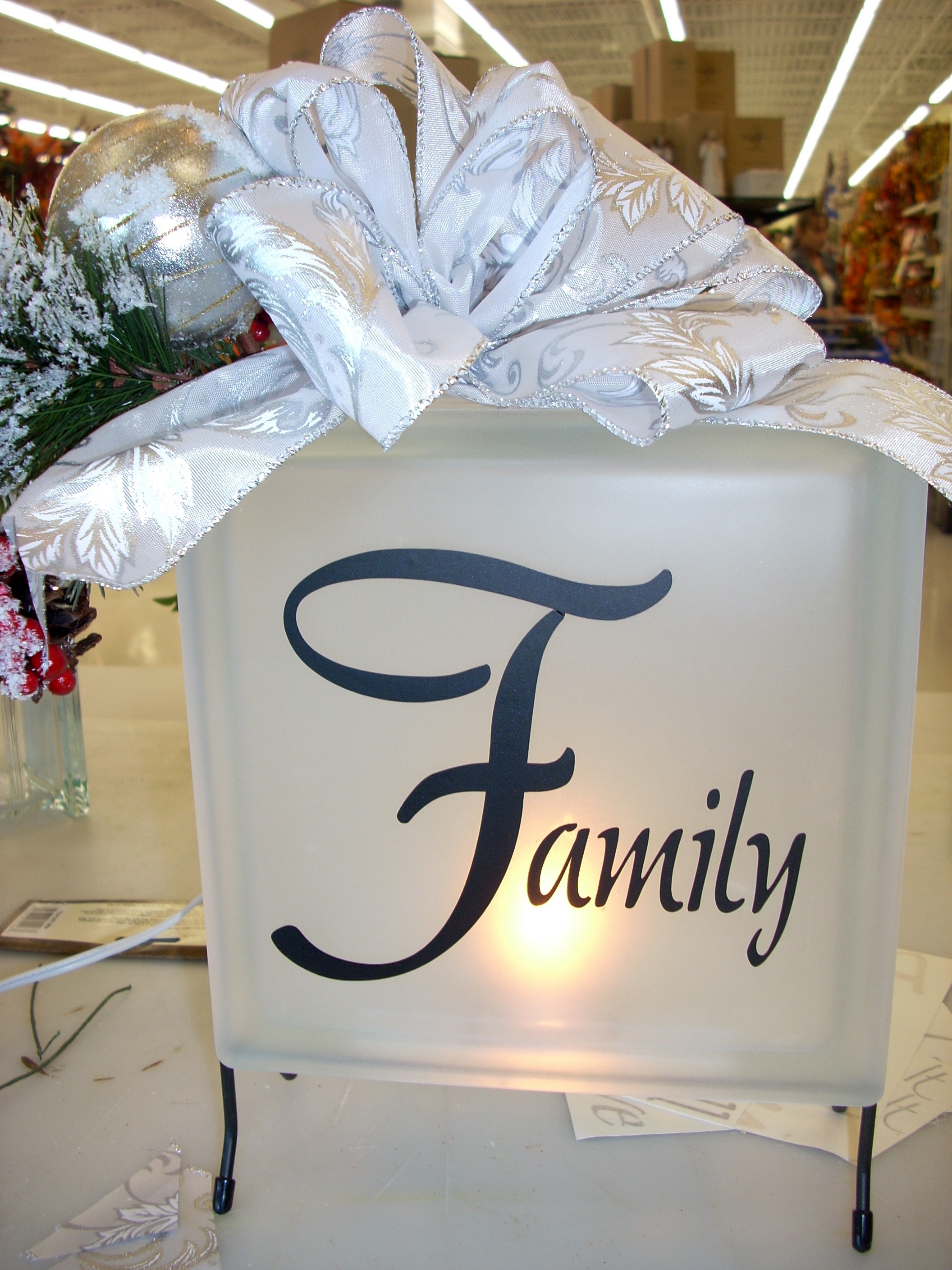This “Family” blok was spray painted with “Frosted Glass” spray paint, allowed to dry and the transfer applied. Two floral picks and a bow were attached with floral cling to the top of the blok.  The blok sits in the large wire frame with a single night light bulb inside.