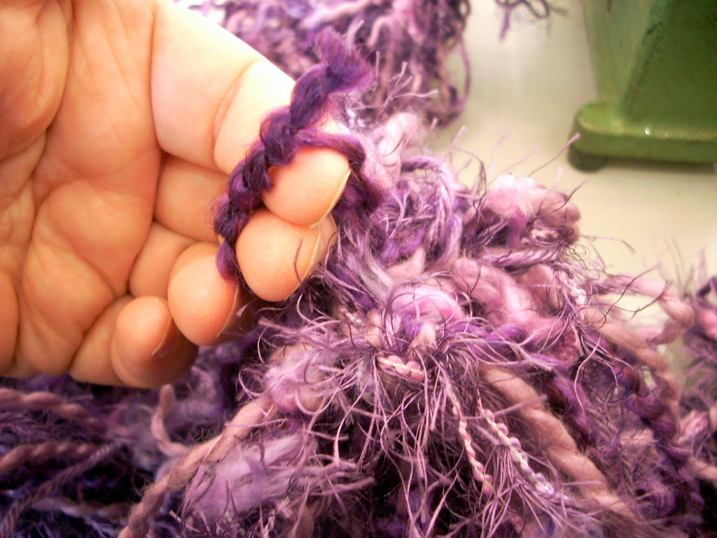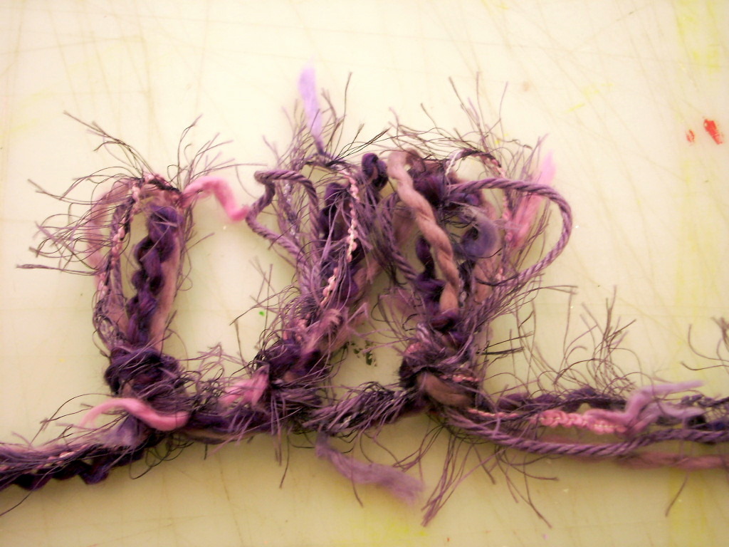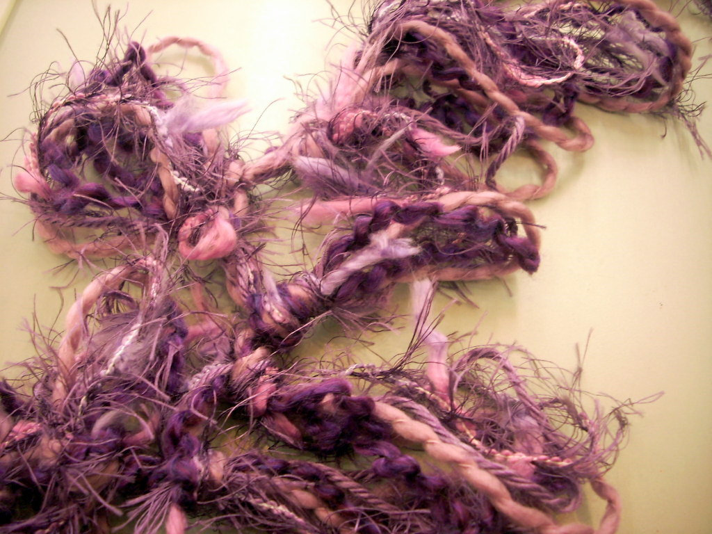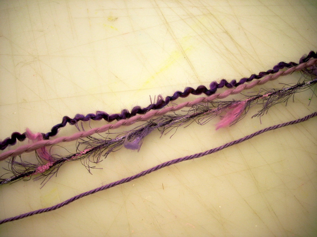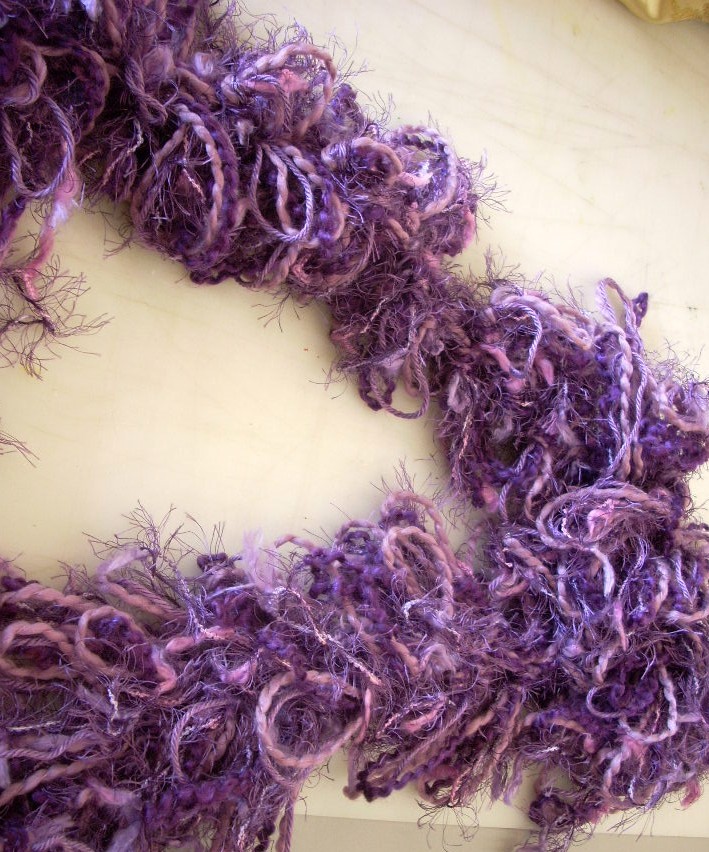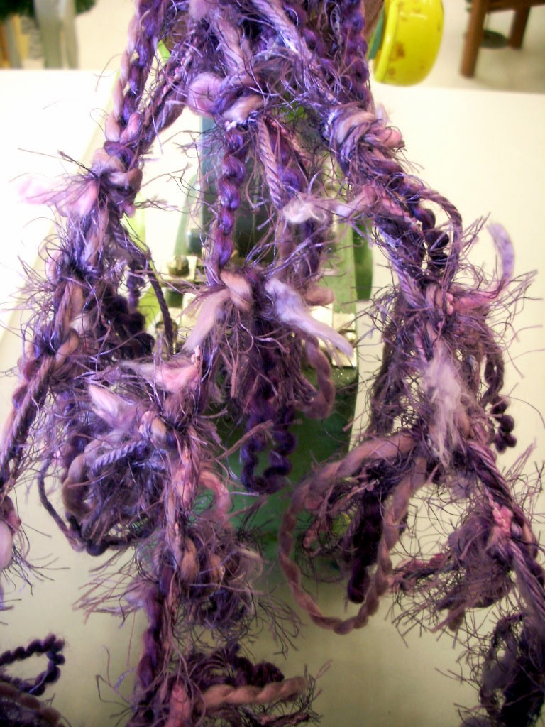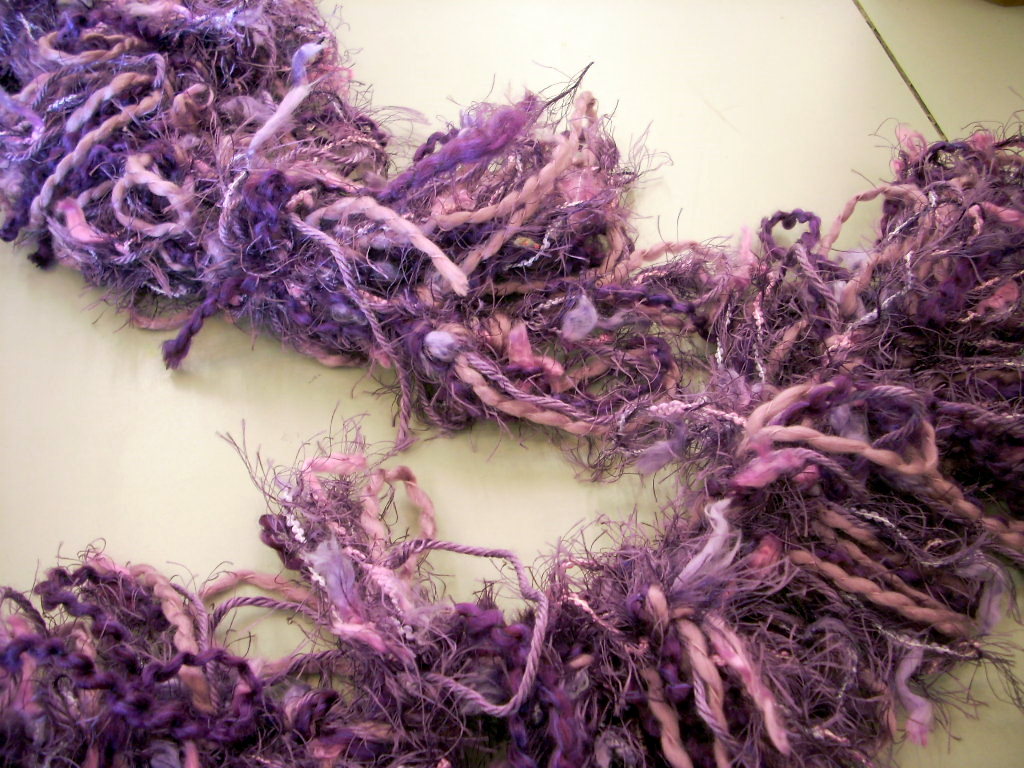 I used four kinds of purple yarn and with the exception of the yarn on the right I could probably get two scarves out of the yarns.