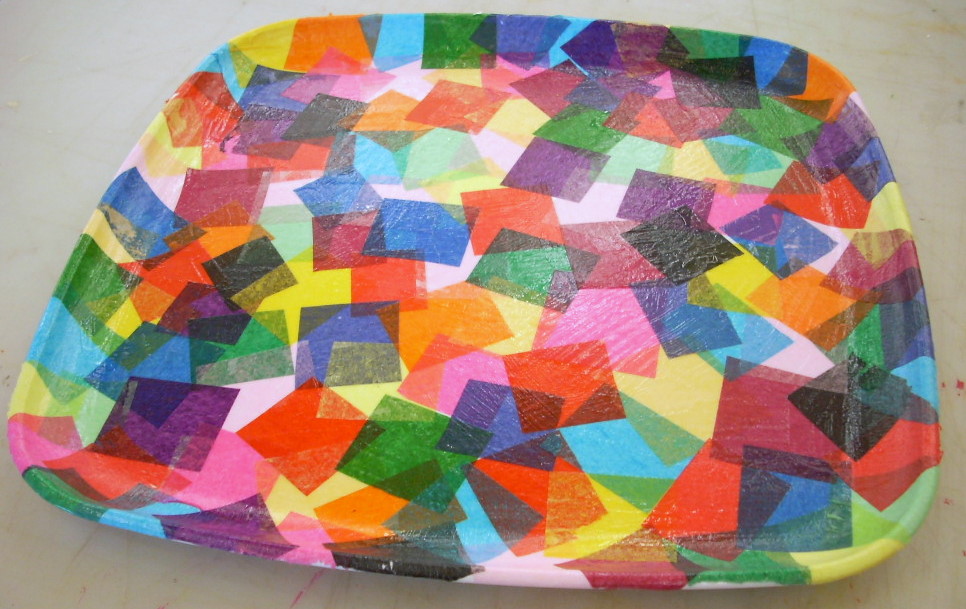 Adhere the tissue paper to the tray with Mod Podge and let it dry.