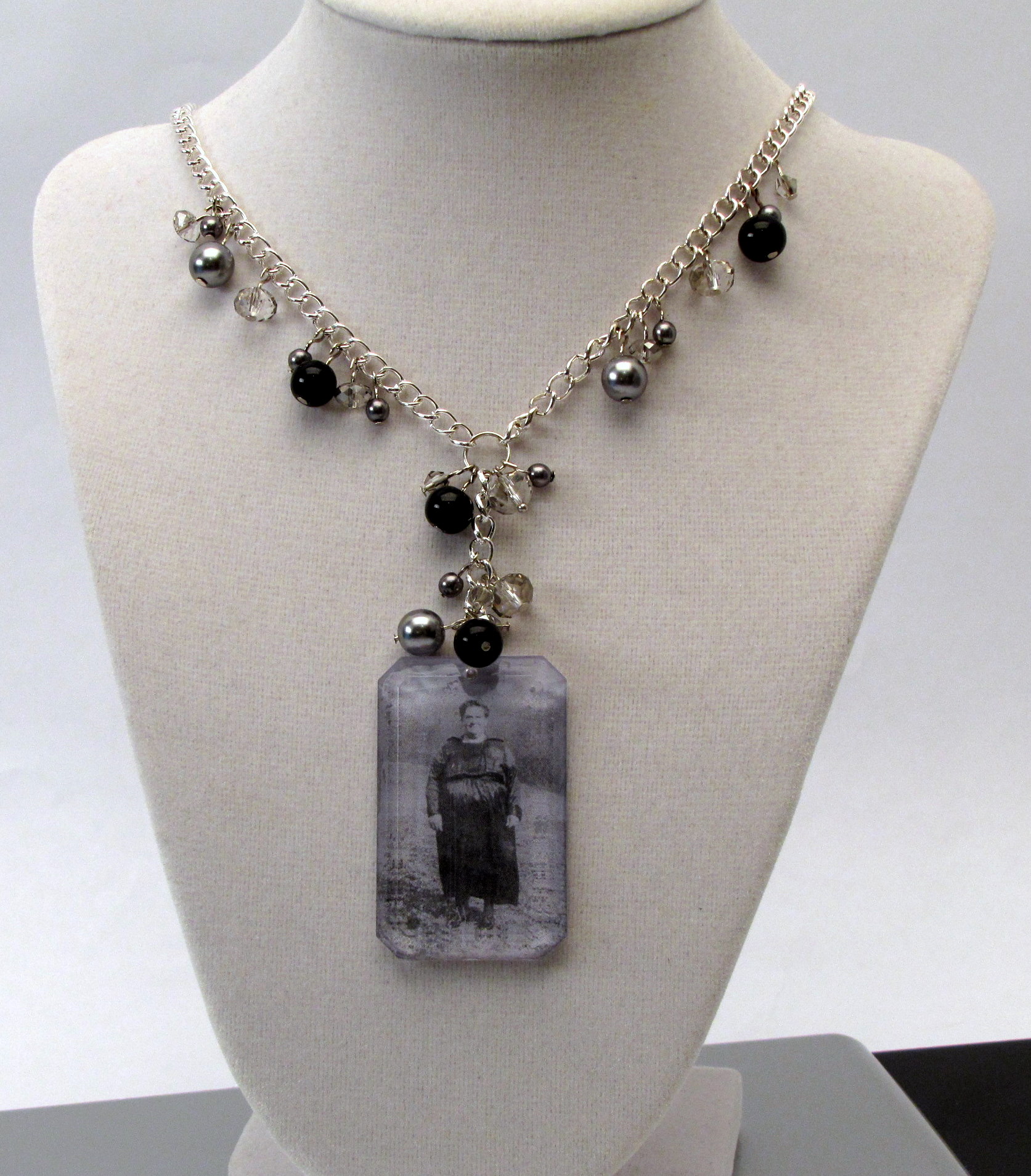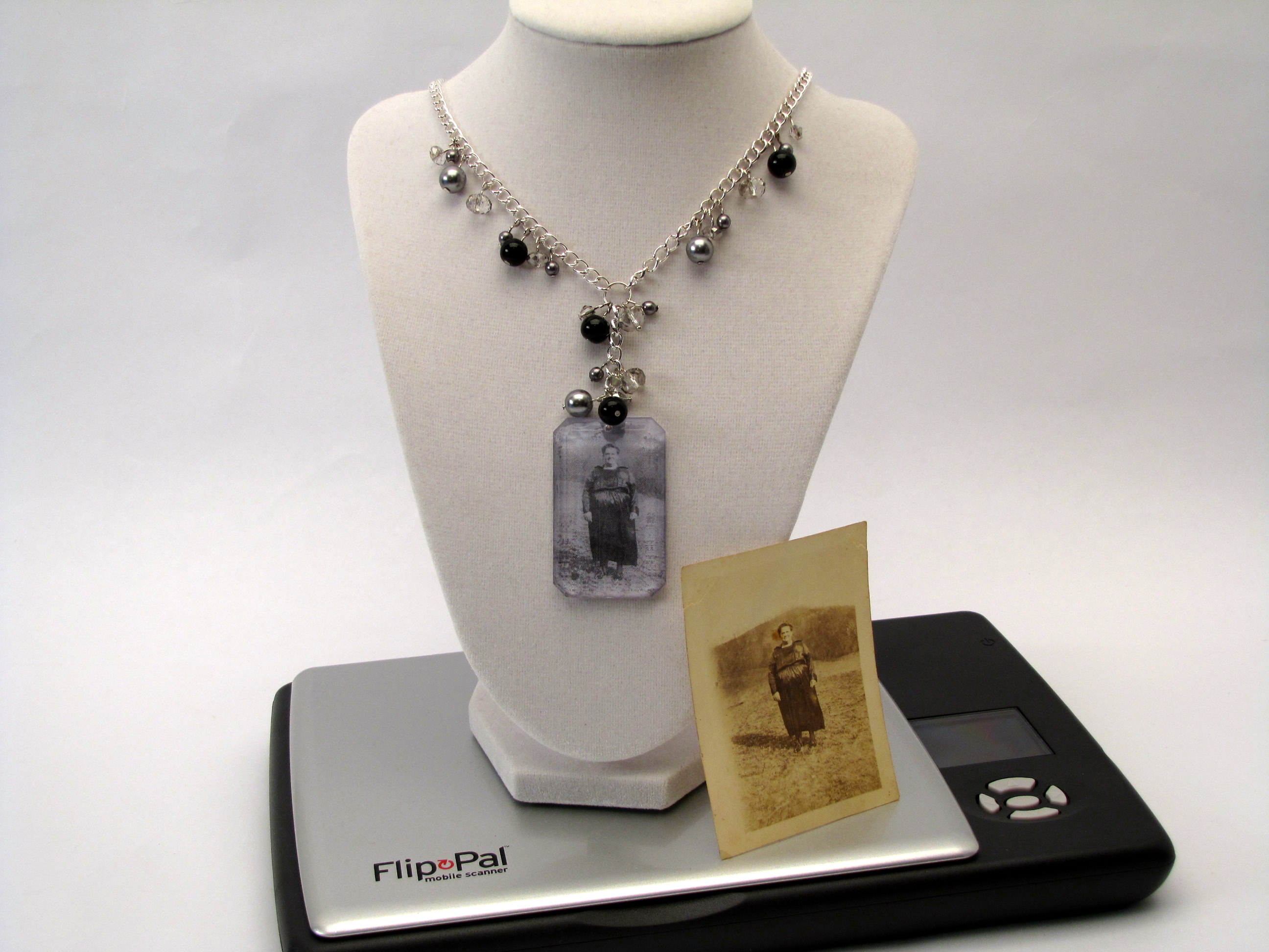 I started thinking about how people have worn photos of loved ones in the past and that led, naturally, to lockets. While I love a good locket, the down side is that you can’t easily see the photo (which is, in some situations, the intent) and I wanted my great grandmother’s photo to show.