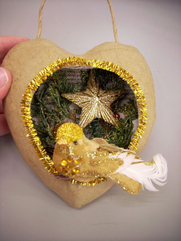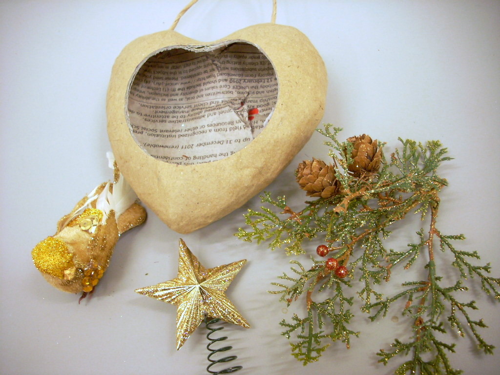 Now, I suppose I could have painted the outside, I could have covered the newsprint inside too for that matter, but I simply LOVED the way the glittery ornaments looked with the rugged heart.