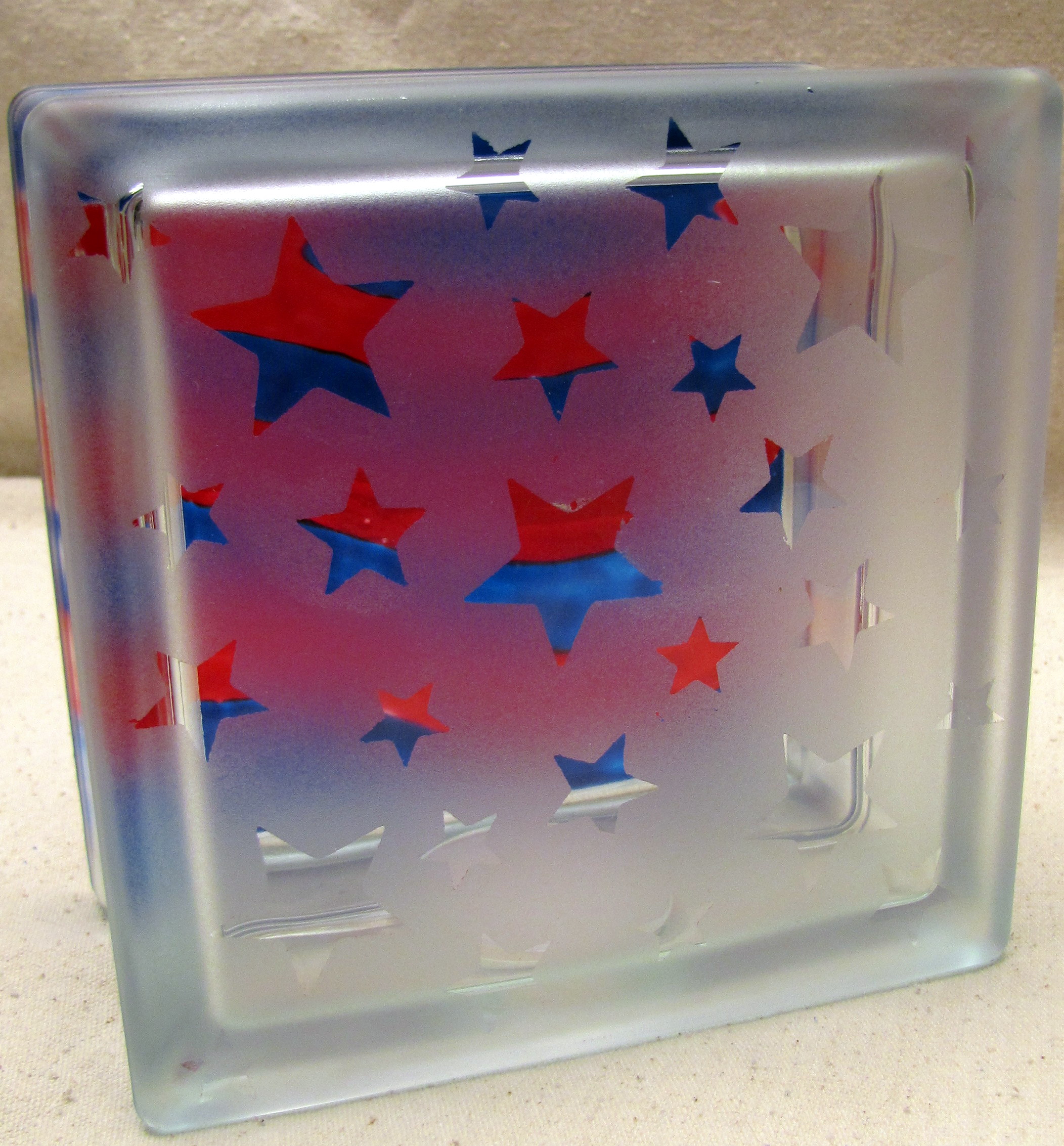 Cover the front of the block with star shaped stickers in various sizes (mine are from Darice). Burnish the edges of the stickers so that the frosted glass spray won’t seep underneath and then give it a coat or two of spray with Rust-Oleum Frosted Glass Spray. Don’t forget the sides!
