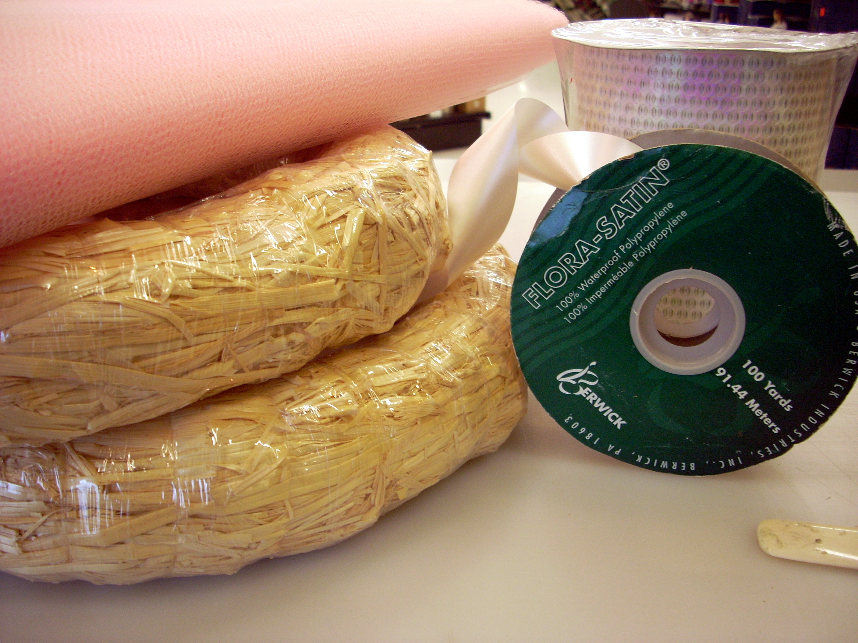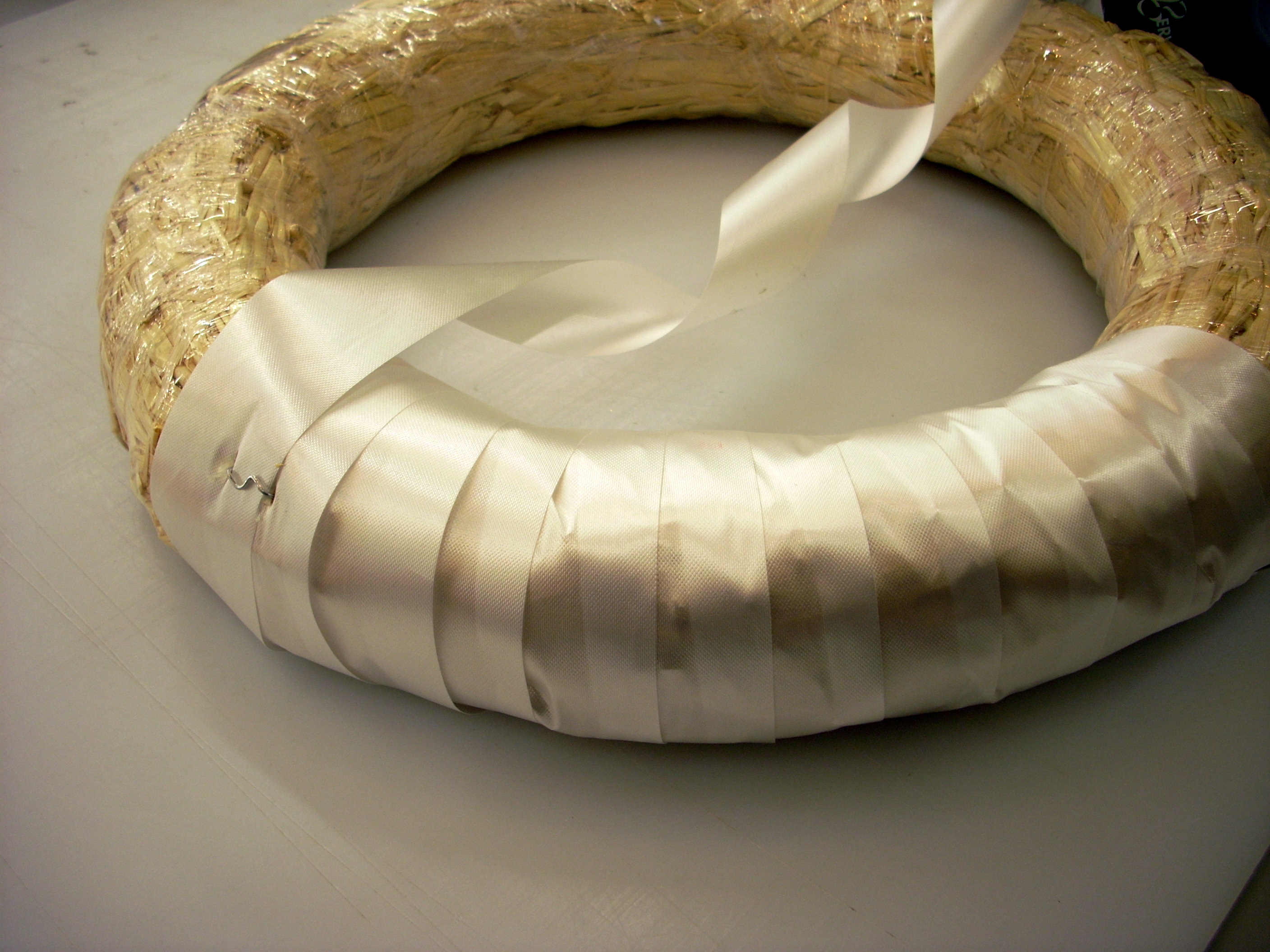 Wrap the flora-satin ribbon around the wreath… leave the plastic on the wreath or you’ll have straw EVERYWHERE! Secure it in a few areas with fern pins.