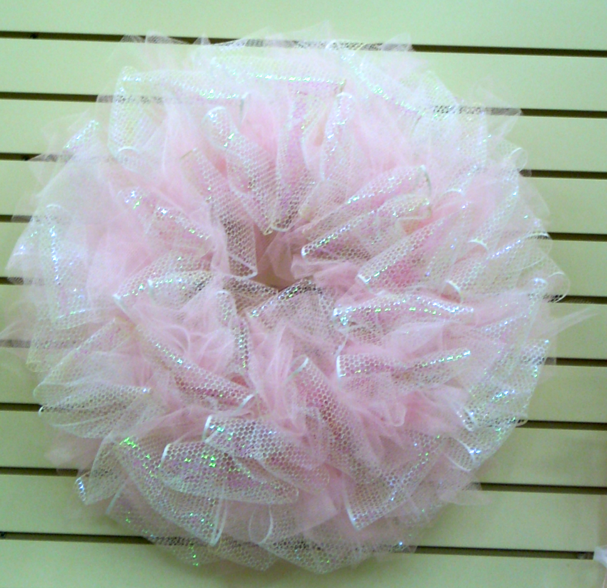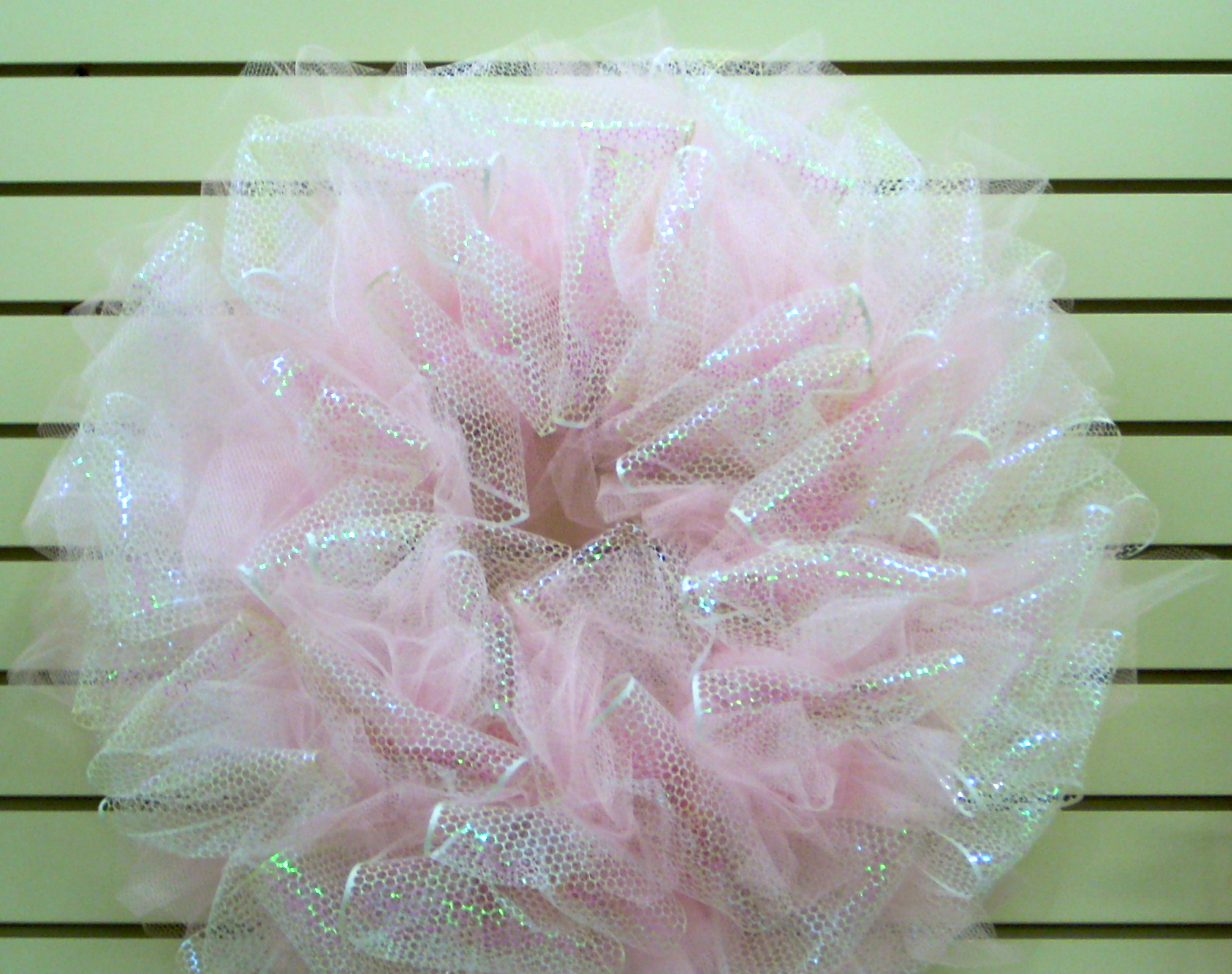 Isn’t this great? It looks like a tutu for the wall! You could also wrap a strand of lights in and around all of the loops of punchinello and tulle for a lighted wreath. What about a strand of heart shaped lights? Maybe a poof of feather boa here and there? There are lots of things you could do with this to make it your own!