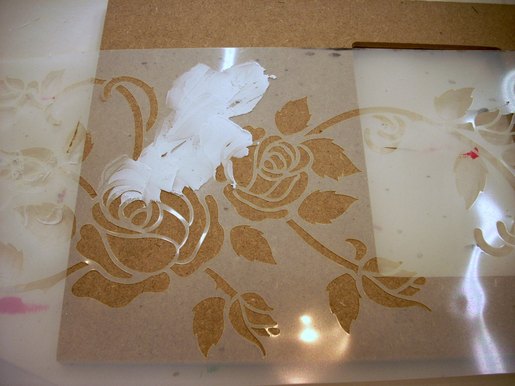 Paint brushes and a sponge. A stencil of your choice (I’ve used a rose stencil), a palette knife and scissors.