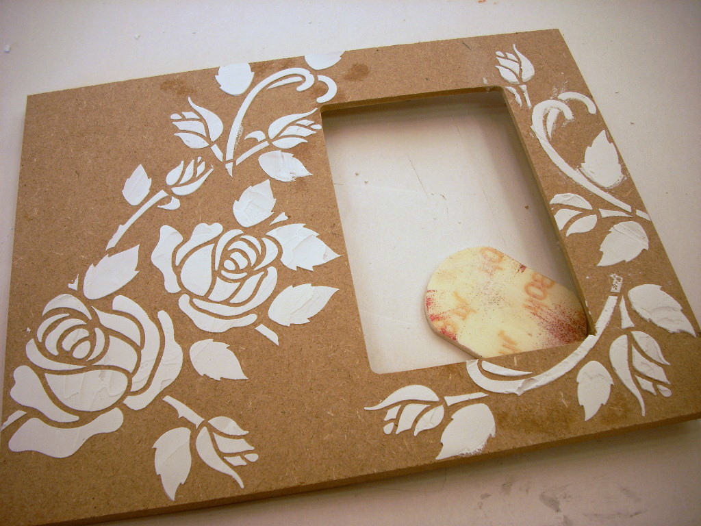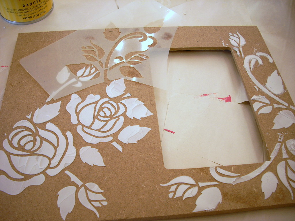 Apply the temporary adhesive to the back of the stencil. Wave it around for a few seconds to let it get nice and tacky. Lay the stencil on the frame and lightly rub over the stencil to adhere it to the frame. Fill in the open areas of the stencil with modeling paste using a palette knife. Don’t put it on too thick. Just a thinnish coat.