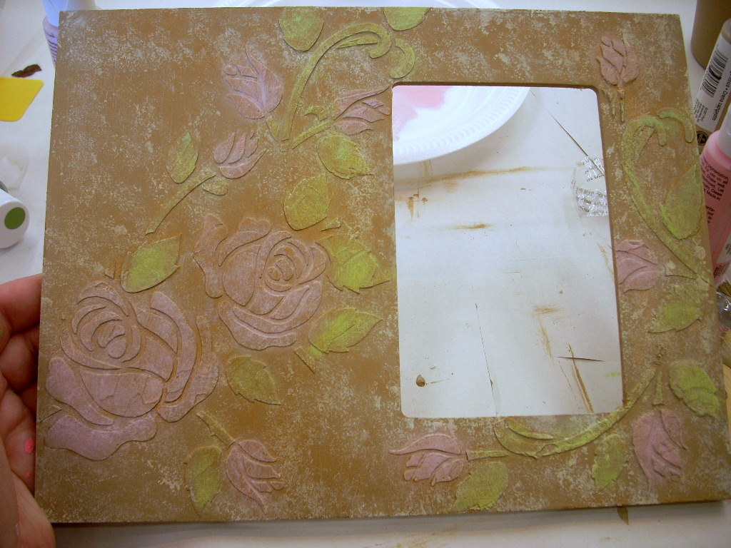 With nearly dry brushes brush Ballet Pink and Baby Pink onto the roses. If the brushes are nearly dry it’s actually hard to get paint where you DON’T want it. Brush the darkest color from the very edges of the raised areas toward the centers. That way the edges are a tad darker than the middle. Then with the lighter pink dry brush a bit near the centers.