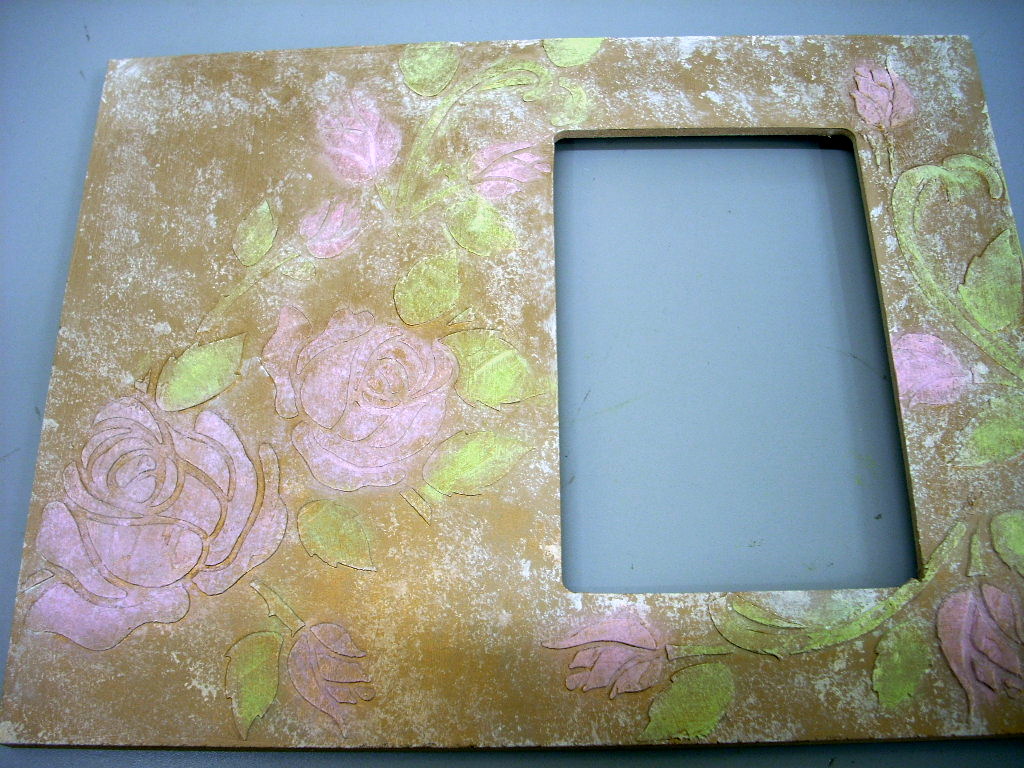Dry Brush Metallic Antique Gold over the whole frame with the wide brush. Let dry. The Metallic Antique Gold just gives the whole thing a little shimmer.