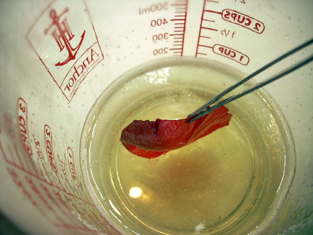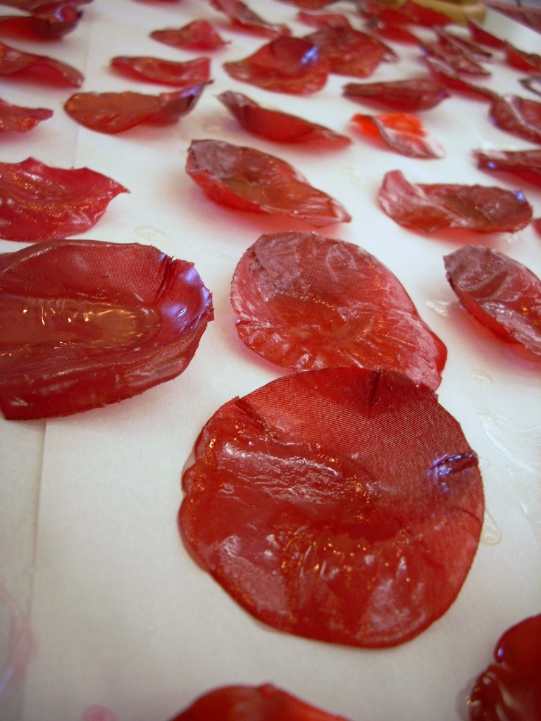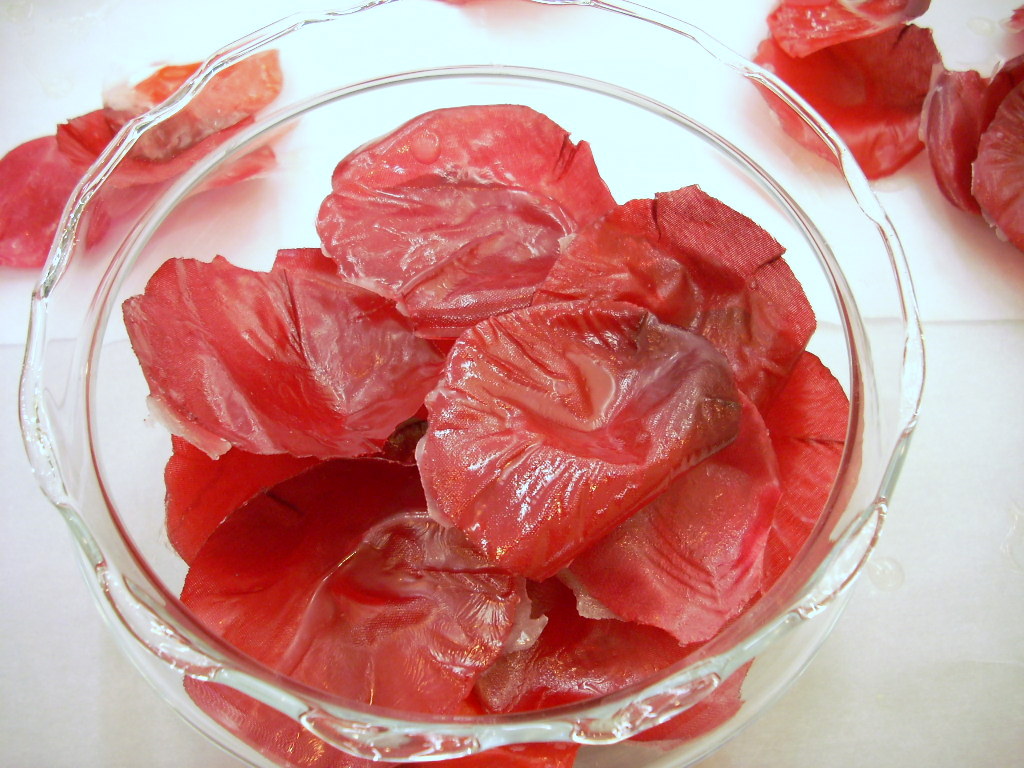 Slightly shake excess soap from the petal and then place it on a piece of parchment to set. The soap sets up quickly.