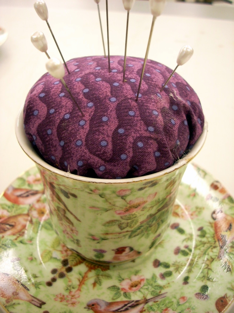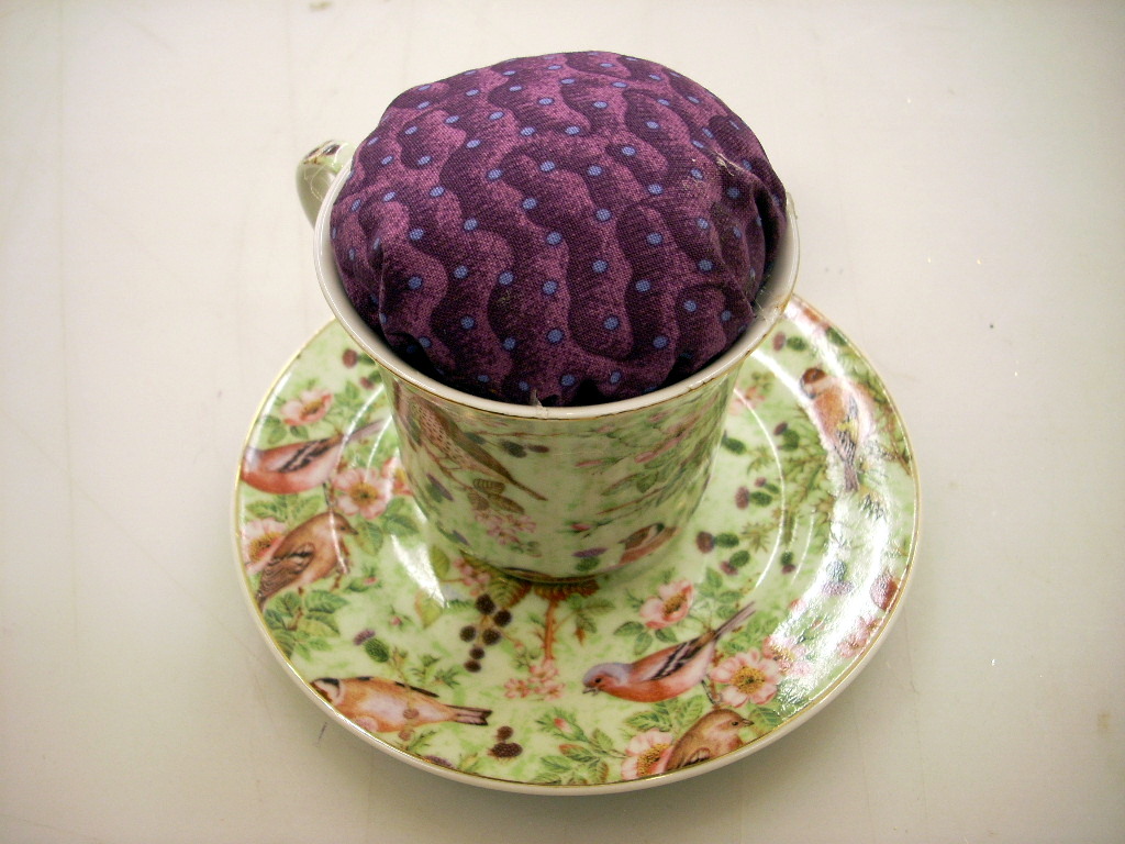 I filled the cup to over flowing with batting and cut a large circle of fabric. Then I covered the top of the cup and tucked the fabric down in the tea cup. I used a pair of closed scissors to tuck the fabric deep into the bottom of the cup. Then, I used my hot glue gun, and while holding the filling back from the rim of the cup I filled the space with hot glue and then let the filling go back in place.You could also glue the cup to the saucer and use the saucer to hold thimbles, thread and small scissors.
