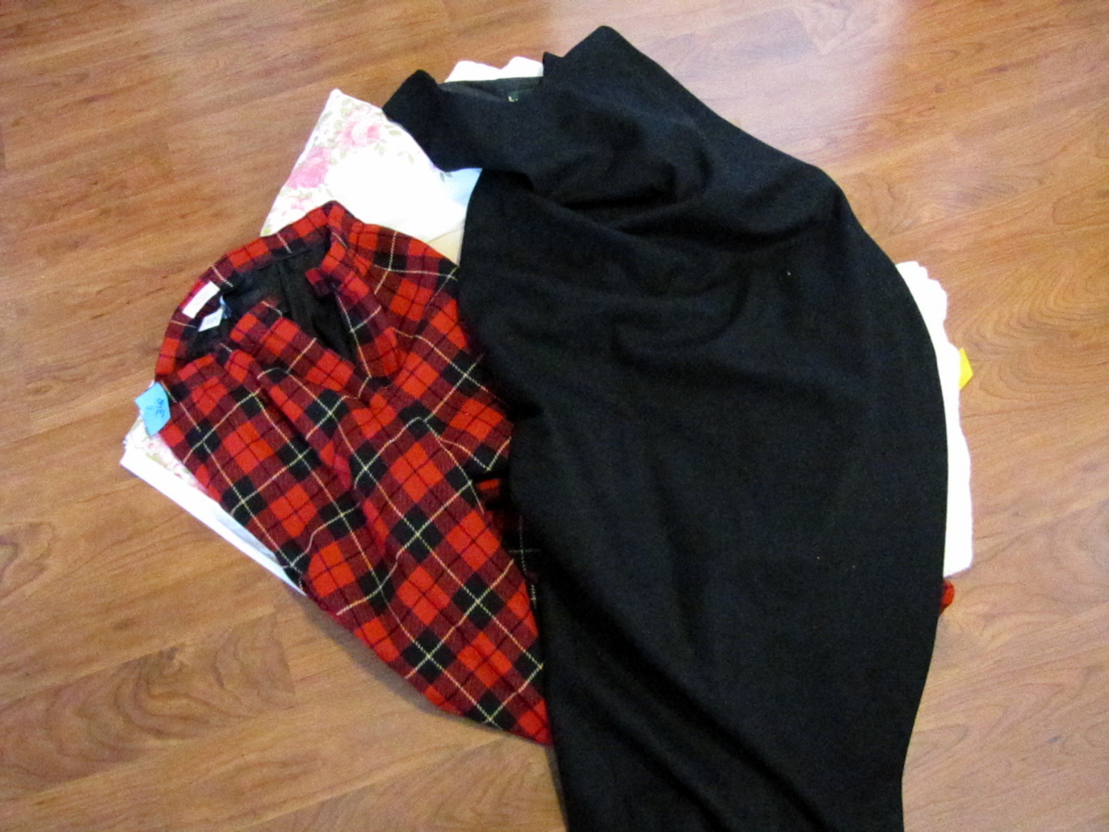 I also found the crazy plaid pants for $3.00. They are 100% Virgin Wool, Authentic Wallace Tartan by Pendleton. And the black fabric that isn’t showing up so well is a jumper dress that is also 100% Virgin Wool for $2.00. I’m thinking about a tote bag with plaid pockets and maybe even a couple of bolster pillows with the pant legs. What about you? What would you make with all that wool?