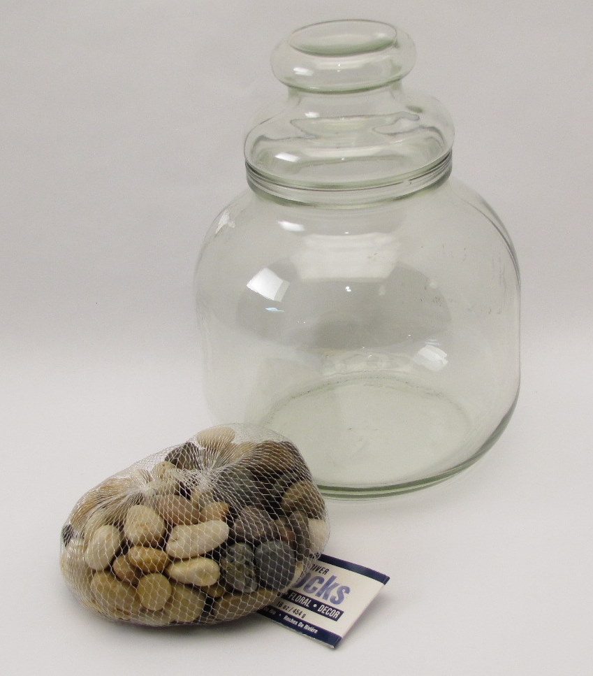 First, I inverted a plastic cup in down in the center of the jar and filled around it with little river rocks from Darice. I put the cup in because I wanted the rock higher around the perimeter and not many in the center. I carefully removed the cup and placed in half of a small fern plant I’ve had. I then filled in around it with soil.