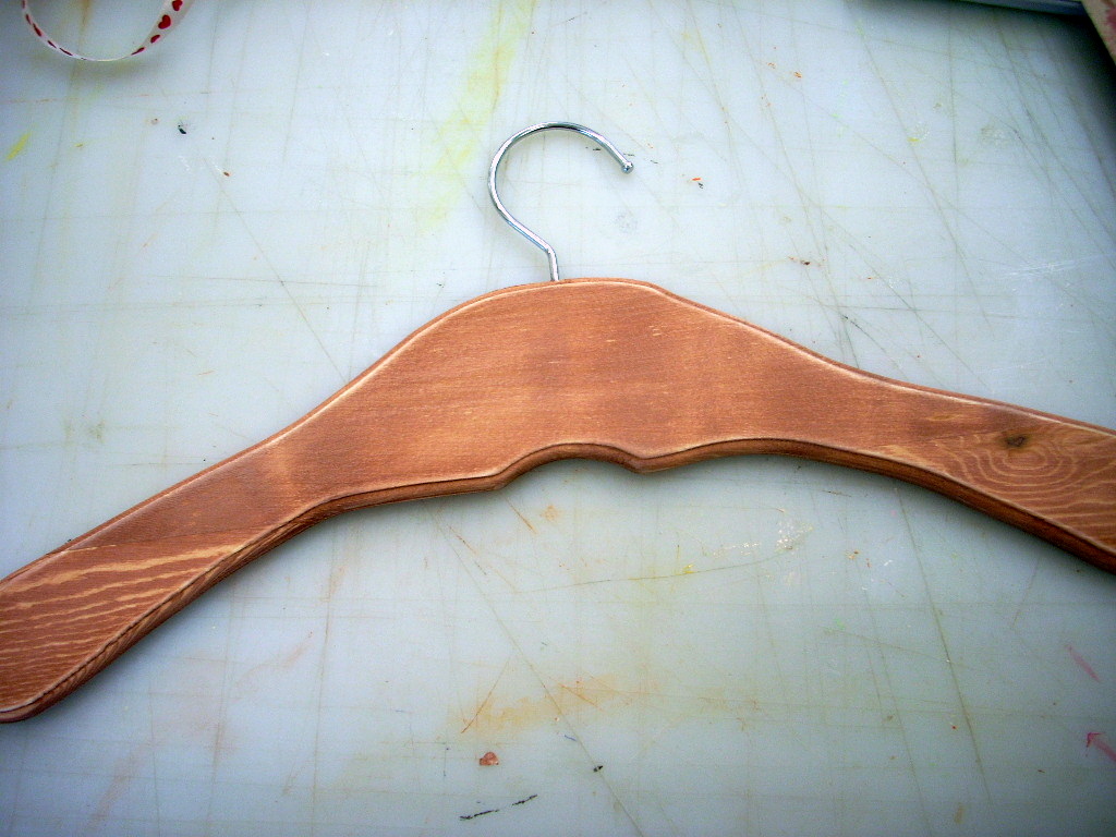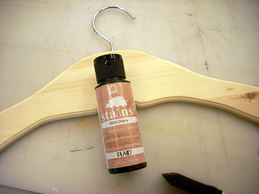 I got a wood hanger from the craft store and stained it with FolkArt Stains in Cherry. It’s one of those brush on and wipe off stains. Easy Peasy.