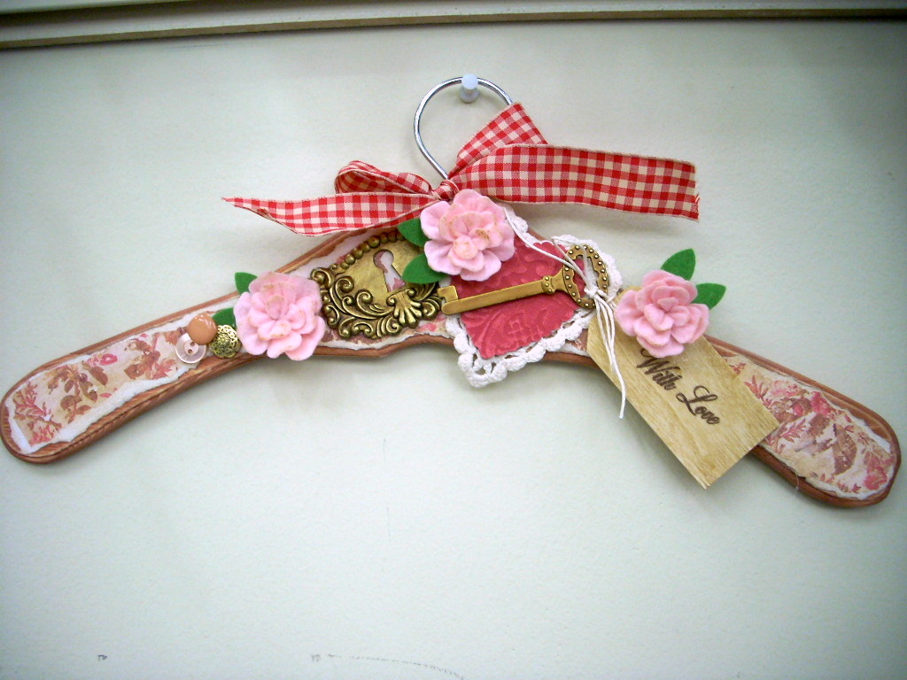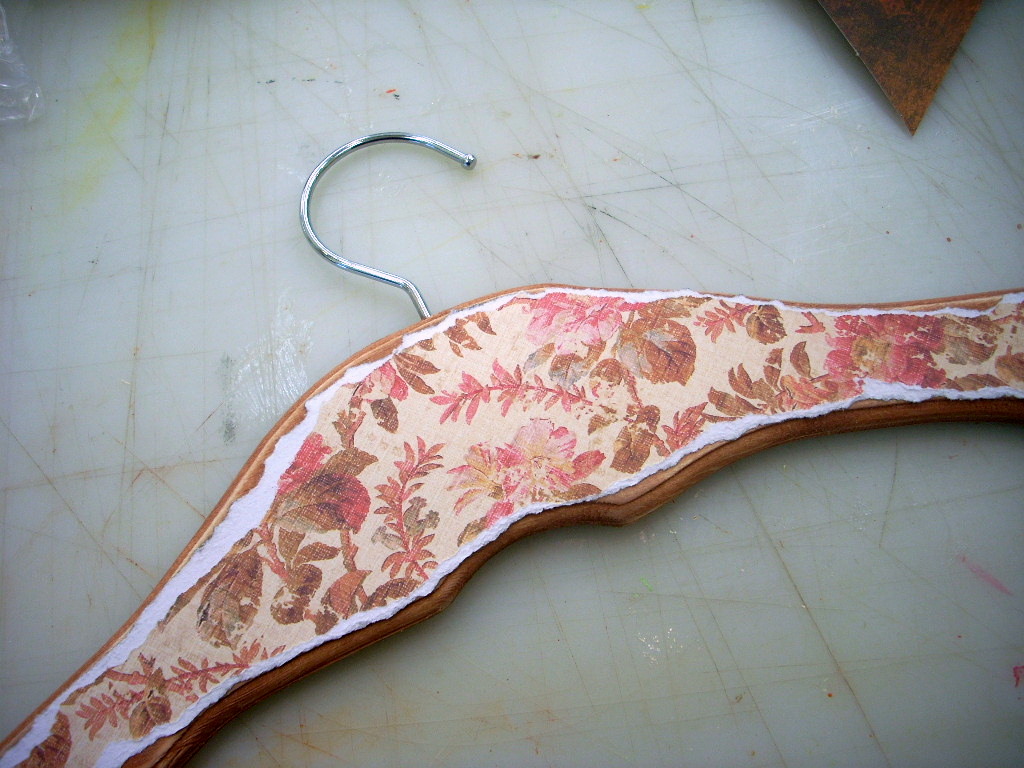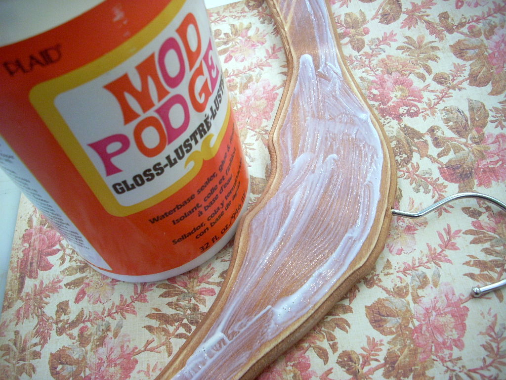 Then I put Mod Podge just inside the raised area of the hanger and applied the paper smoothing it down while it dried. (For tips on working with Mod Podge and paper visit the Tips Page on the Mod Podge Rocks Blog). Let the Podge dry completely before going on to the next step.