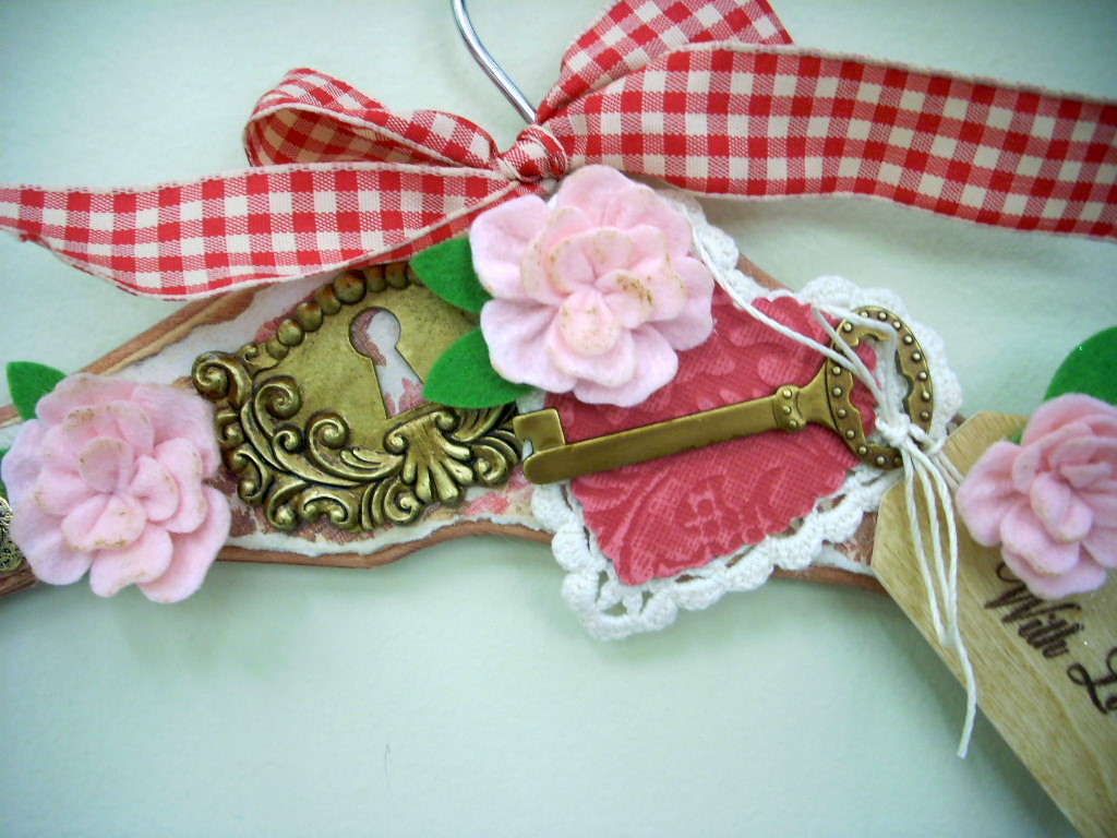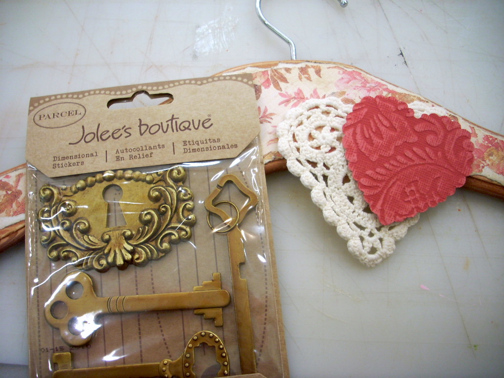 Time to embellish. I found a heart shaped doily and some Jolee’s Boutique key stick-on embellishments.
